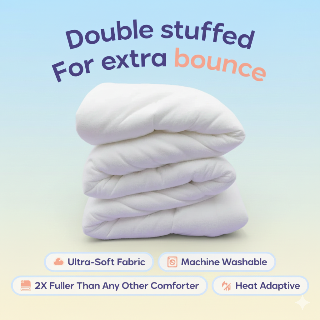 The Marshmallow Dream™ is Double-stuffed for that melt-in feeling you crave at night. Light, breathable, and perfectly cozy without overheating. Crafted from baby-safe fabric and designed to stay fluffy, wash after wash. This is comfort that will give you your softest sleep yet.